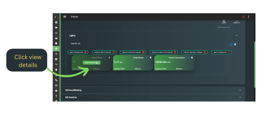 - Hover over the created Modbus device parameter to see ‘View Details’ (highlighted in green).