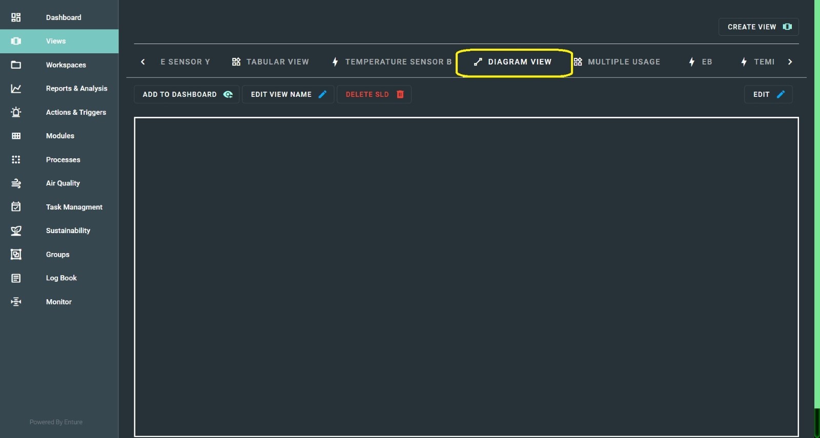 To create a Diagram View, you must create a name for the view, choose the view type as Diagram View, enter a description, and click the submit button. Then, your Diagram View will be created, and the name (for example, “Diagram View”) you have given will be displayed on the tab.